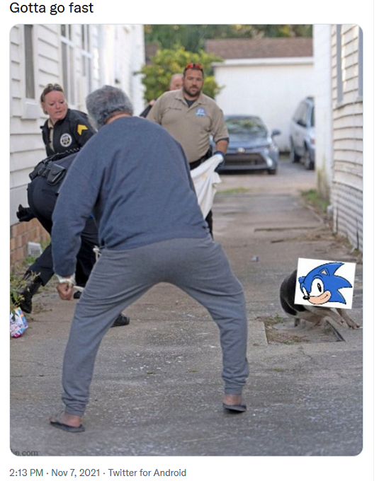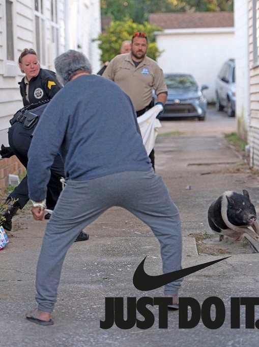 Dicha publicación de la Policía de Pensacola (Florida) iba acompañada del siguiente texto: "Vamos a dejar que estas fotos hablen por sí mismas. Pongan la música de Benny Hill", bromearon citando una canción country frecuentemente utilizada como música de fondo en escenas cómicas de persecución.
