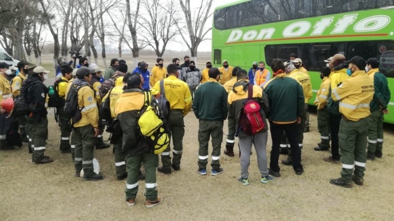 Un colectivo con 45 brigadistas arribaron este miércoles al mediodía al puesto del Servicio Nacional de Manejo del Fuego (SNMF) montado en el aeródromo de Alvear, 15 kilómetros al sur de Rosario.