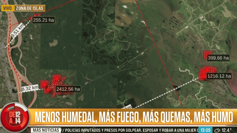 De 12 a 14 (El Tres) reflejó desde el Delta las nuevas columnas que persistían por la sequía y las ráfagas que dificultaban el control de las llamas por parte de los brigadistas.