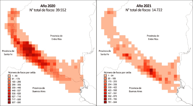 El año pasado, los 14.722 focos registrados afectaron a unas 208 mil hectáreas (9% del Delta). En 2020, los puntos de calor fueron 39.552 (equivalente a unas 550 mil has).