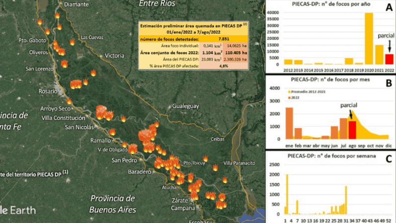 La estimación preliminar del área quemada en todo el Piecas en lo que va del año asciende a 110 mil hectáreas del total de 2,3 millones. Casi el 5% del Delta del Paraná fue afectado solo este año, que es menor a lo arrasado en 2021 y sobre todo en 2020.