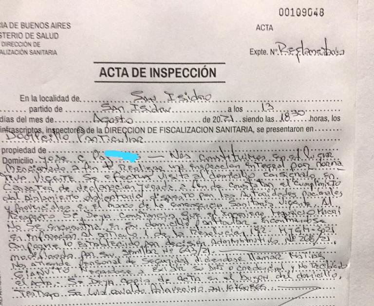 "Se dejó constancia que el ingeniero Mauricio Macri no se encuentra en su domicilio encontrándose en infracción al artículo 1 de la Resolución 192/2021" indica el acta oficial.