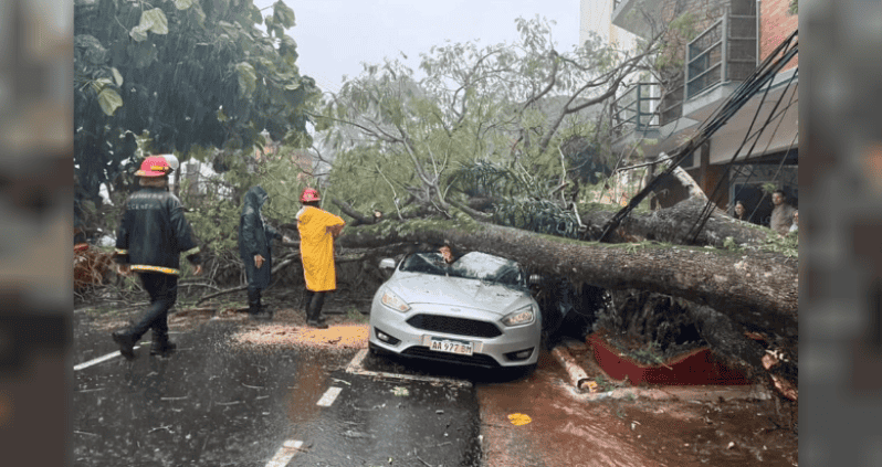 Fue en la capital donde los bomberos rescataron a un médico que había quedado atrapado en su vehículo luego de que un árbol de gran porte cayera sobre el mismo en la intersección de las calles 25 de Mayo y avenida Mitre. El conductor no presentó lesiones y fue asistido en el lugar.