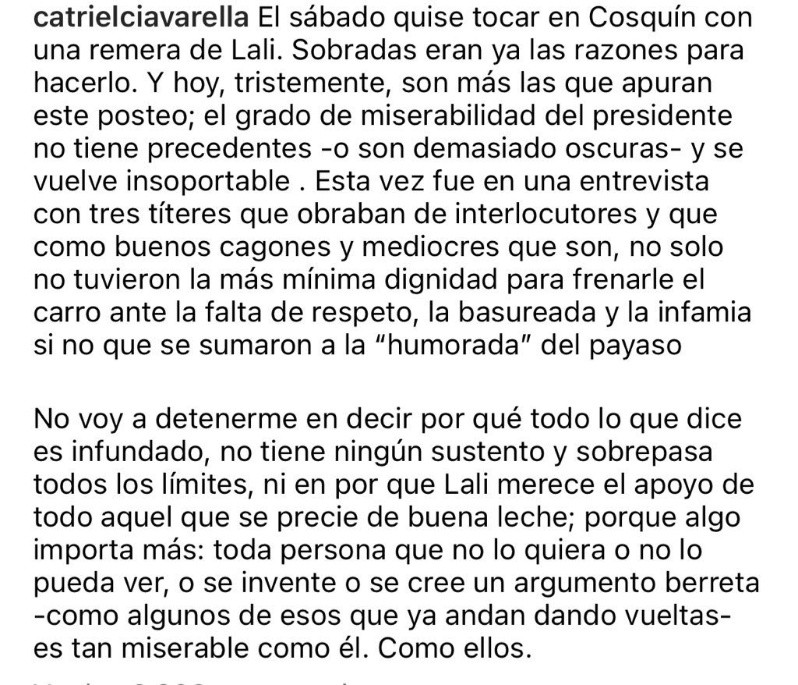 Catriel Ciavarella, baterista de la misma banda, también se manifestó en redes sociales. "El sábado quise tocar en Cosquín con una remera de Lali. Sobradas eran ya las razones para hacerlo. Y hoy, tristemente, son más las que apuran este posteo; el grado de miserabilidad del presidente no tiene precedentes -o son demasiado oscuras- y se vuelve insoportable", dijo.