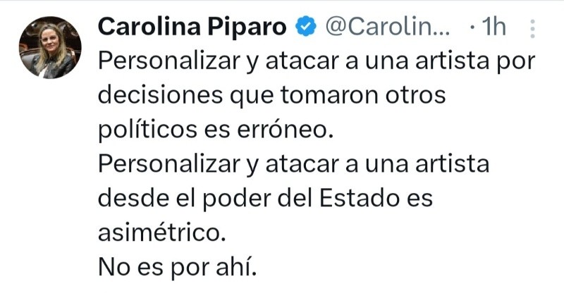 Una de las publicaciones más llamativa fue la de Carolina Píparo, ex candidata a gobernadora bonaerense por La Libertad Avanza: “Personalizar y atacar a una artista por decisiones que tomaron otros políticos es erróneo. Personalizar y atacar a una artista desde el poder del Estado es asimétrico. No es por ahí”, escribió en su cuenta de X.