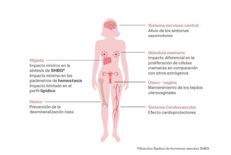 Estudios recientes demostraron que tiene un mejor perfil de seguridad sobre el tejido mamario, y que previene la desmineralización ósea. Adicionalmente, más del 97% de las mujeres que incorporaron este nuevo estrógeno no reportaron disminución de su libido, con un impacto favorable en el bienestar sexual.