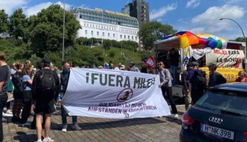 Mientras tanto, la demostración convocada por diversos grupos de izquierda en contra del mandatario libertario comenzó pasado el mediodía en Alemania, en los muelles de Landungsbrücken.