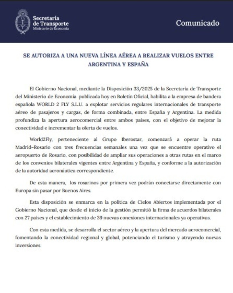 La disposición oficial, publicada este viernes en el Boletín Oficial, forma parte de la estrategia de apertura aerocomercial y busca ampliar la oferta de vuelos internacionales. Con este paso, los pasajeros rosarinos podrán viajar a Madrid sin necesidad de pasar por Buenos Aires y, desde allí, acceder a múltiples destinos en Europa gracias al acuerdo de interlínea con Iberia.