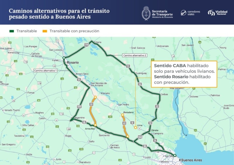 Camino 1: Desde Rosario tomar la RN 9 hasta San Nicolás, luego continuar por la RN 188 (hasta Pergamino) o la RP 51 (hasta Arrecifes) o la RP 41 (hasta San Antonio de Areco); en cualquiera de los tres casos podrá seguir por la RN 8 por la que podrá continuar hasta CABA. Camino 2: Desde Rosario tomar la RN 174, hasta Victoria – Entre Ríos, continuar por la RP 11 hasta Gualeguay, luego circular por la RN 12 Zárate, donde podrá continuar por la RN 193 o bien continuar por la RN 9 que le permitirá continuar hasta CABA. Se recuerda que la Ruta Nacional 8 está habilitada en su totalidad y que en la RP 51 tram. RP 30- RN5 (puente sobre Cañada de Chivilcoy) y en la RP 30 - tramo RP 51 - Acceso a Huergo (puente sobre Cañada "La Martija"). A su vez, se solicita a todos los usuarios circular con precaución, después de que el tránsito fuera interrumpido por unos días. Si requiere asistencia para emergencias podrá comunicarse con el Centro de Atención al Usuario las 24 horas, todos los días, llamando a las líneas gratuitas 0800-222-6272 / 0800-3330073 o enviando un mensaje de texto vía Whatsapp. Además, antes de iniciar un viaje es importante verificar el estado de las rutas en la web de Vialidad Nacional: argentina.gob.ar/rutasnacionales. Por otras consultas, gestiones y/o reclamos podrá comunicarse de lunes a viernes de 9 a 17 horas llamando al 0800-222-6272 / 0800-333-0073, vía correo electrónico a la dirección atencionalusuario@vialidad.gob.ar o mediante el formulario web.