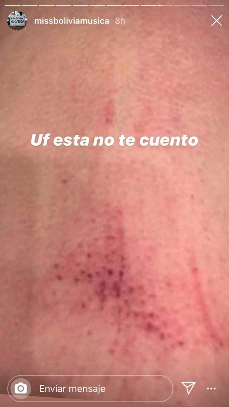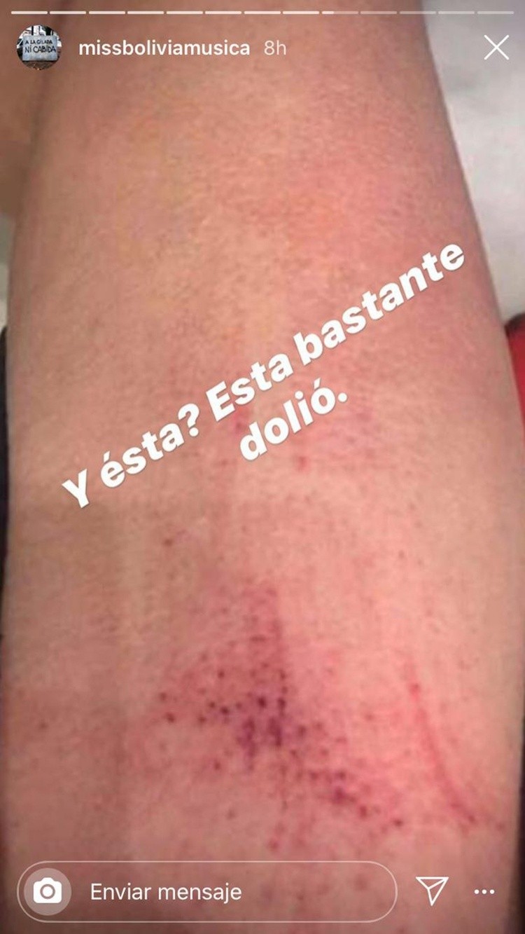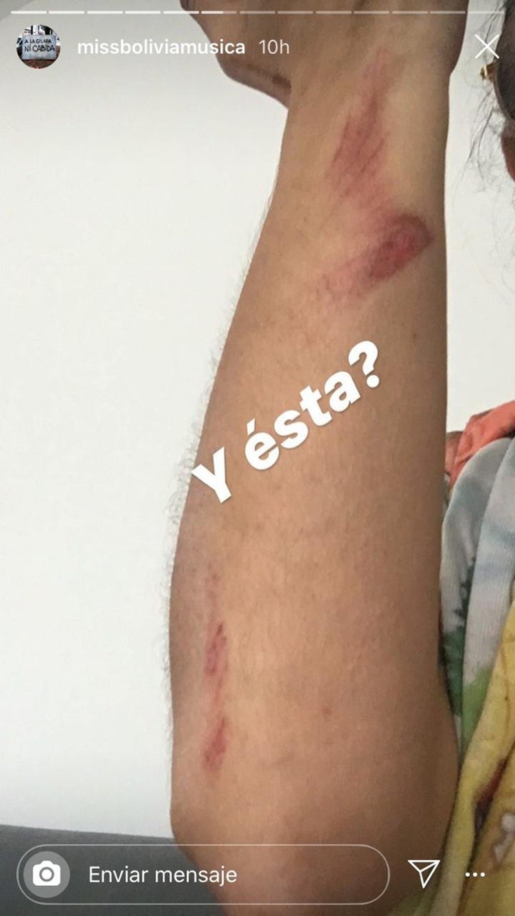 Este domingo, Miss Bolivia volvió a usar su cuenta en Instagram y, en primer lugar, publicó una encuesta. “Qué lindas son las capturas de pantalla. ¿A vos te gustan?”, preguntó, sin dirigirse a nadie en particular, y dejando la posibilidad de responder por sí o por no. En otra story escribió “a mí sí” y subió una serie de fotos que revelan heridas en su cuerpo. Se puede observar un moretón a la altura de su pómulo y raspones en sus brazos.