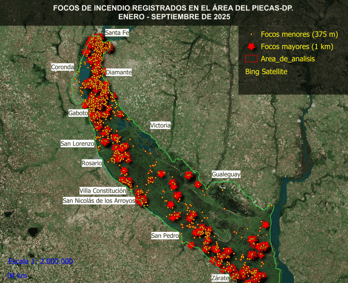 El estudio de la UNR, que procesa información provista por el programa Firms de la Nasa, incluyó mapas de sitios donde se georrerencian los focos ígneos. La presentación del periodo enero-septiembre de 2025 desmiente de forma visual la premisa de que la mayoría del fuego se concentra solo frente a Rosario y no más al norte.