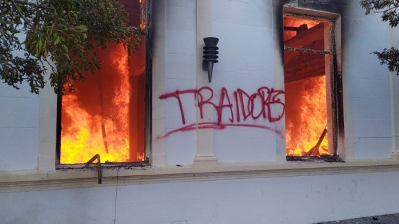 Los manifestantes de Rawson y otras ciudades lograron superar las vallas de contención que ubicó la policía en las ochavas y, una vez que ingresaron a la peatonal que separa la Casa de Gobierno de la residencia del gobernador Mariano Arcioni, comenzaron los destrozos contra la estructura del edificio y un incendio generalizado que obligó a la intervención de los bomberos.
