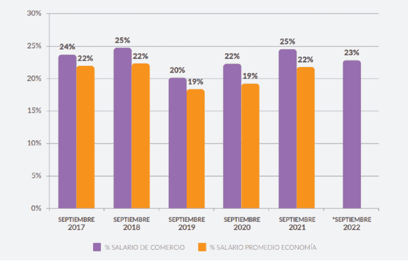 Para el caso de departamentos de un dormitorio, como se observa en uno de los gráficos que acompañan el informe, la proporción que representa el gasto de alquiler en los salarios del sector Comercio fluctúa entre el 20 y 25 por ciento en el período 2017-2022, registrando el valor más bajo en septiembre de 2019.
