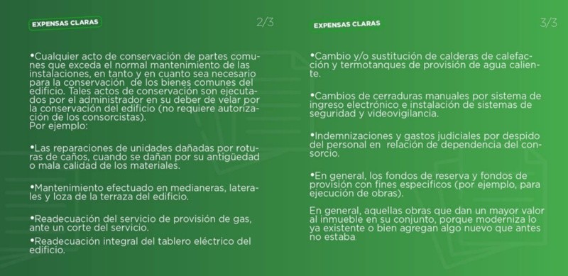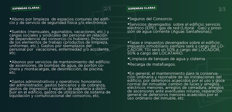 "Dentro de lo que son expensas ordinarias, que es lo que hace al mantenimiento habitual del edificio, hay gastos que le corresponde pagar en forma directa a quien vive en el edificio, sea inquilino o propietario", dijo y precisó que se trata de cuestiones como arreglos de ascensores o bombas de agua, sueldos de personal de limpieza o de seguridad, los honorarios de la administración, entre otros.