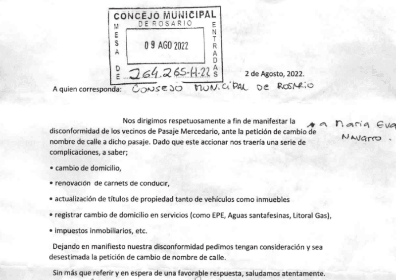 A mediados del 2022, un grupo de vecinos que viven en pasaje Mercedario, ubicado en Fisherton, se enteraron que el Concejo les había cambiado el nombre a su cuadra. Si bien la situación podría considerarse como anecdótica, esa modificación los obligaba a un sinfín de trámites burocráticos.