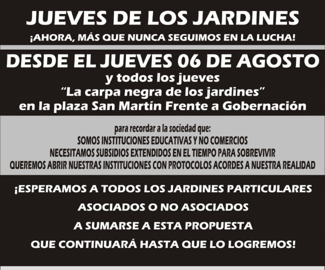 Los dueños y responsables de jardines de infantes de Rosario montaron este jueves una “carpa negra” para reclamar mayor asistencia del gobierno provincial en medio de la crisis por la falta de actividad en el marco de la pandemia de coronavirus.