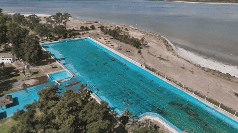 La estructura está en el balneario El Edén. Tiene 158 metros de largo por 50 de ancho con 12 millones de litros de agua salada. Pero no, el secretario de Turismo de Teodelina, Leonel Ward, no confirma que esa sea la piscina más extensa del país.