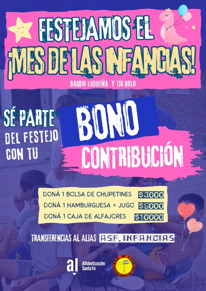 “En el mes de las infancias los invitamos a ser parte del festejo. Con tu aporte nos ayudás a organizar la fiesta de las infancias en barrio Ludueña y en Tío Rolo. Podés colaborar transfiriendo el monto que puedas al alias asf.infancias”, indica el mensaje que difundieron.