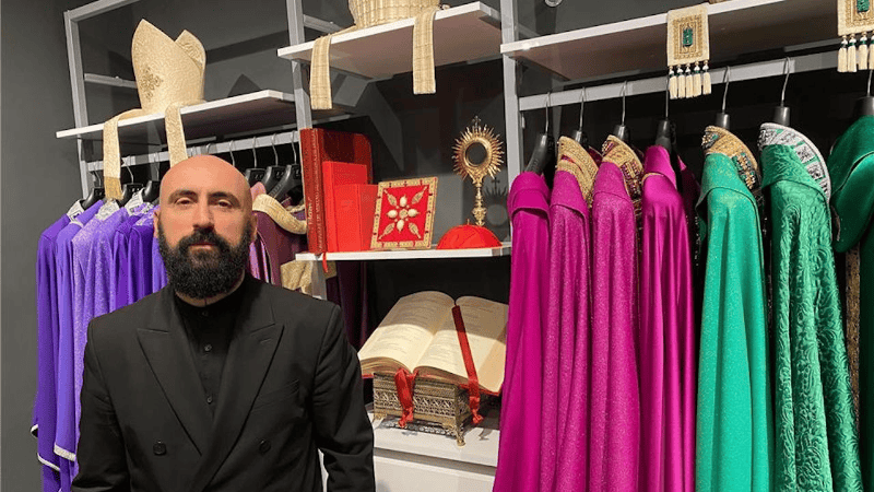El diseñador, nacido en Mondolfo en 1975, tiene su propia firma de vestimentas litúrgicas y además es perfumista. Con estudios en música sacra y teología, sale de lo común en el mundo de la religión con su estilo disruptivo con tatuajes y piercings.