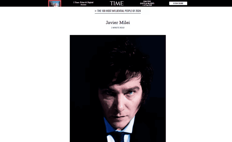 Según la reseña de la edición 2024, a cargo de la periodista Vera Bergengruen, el líder libertario "se transformó en un ícono mundial para la derecha". Y profundiza en el artículo: "Aunque es demasiado pronto para saber si las medidas del nuevo presidente tendrán éxito, está claro que ha acertado en una cosa: con Milei en el poder, Argentina no tendrá vuelta atrás".