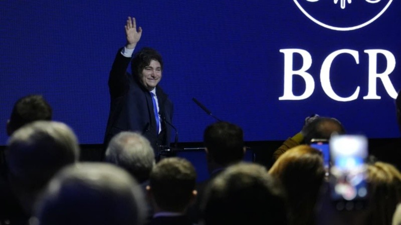 Luego de los discursos de Maximiliano Pullaro y Pablo Javkin, Milei subió al escenario y anticipó que hablaría sobre tasas de interés. "Será una charla técnica, acorde al auditorio", sostuvo desde su atril.