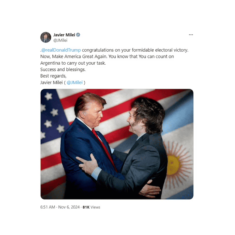 "Felicitaciones por su formidable victoria electoral. Ahora, Make America Great Again. Saben que pueden contar con Argentina para llevar a cabo su tarea", posteó el primer mandatario, en inglés, a través de su cuenta de X.