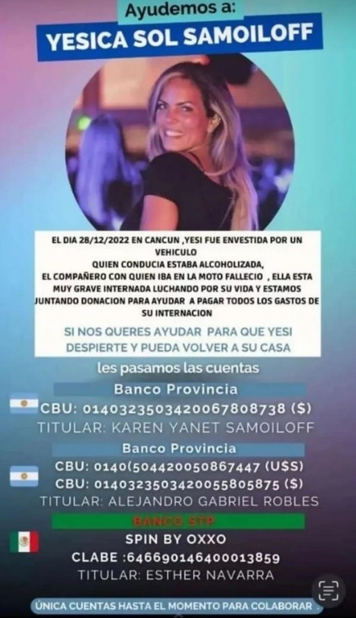 En la noche del 28 de diciembre una chica de 14 años que manejaba un auto de alta gama por las calles de Cancún embistió una motocicleta en la que circulaban un jóven mexicano y una argentina de 33 años. El chico falleció en el instante y Yésica Sol Samoiloff, se encuentra internada en coma inducido.