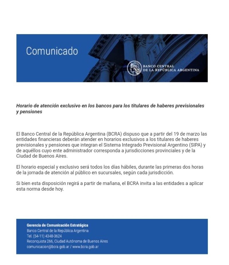 Agregó que el horario especial y exclusivo será todos los días hábiles, durante las primeras dos horas de la jornada de atención al público en sucursales, según cada jurisdicción.