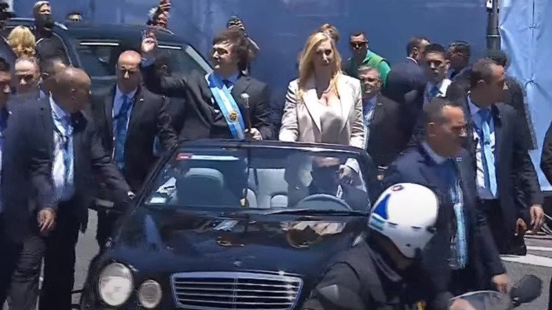 Luego de su discurso en las escalinatas del Congreso, el presidente Javier Milei se trasladó a la Casa de Gobierno en un auto descapotable a lo largo de la Avenida de Mayo.