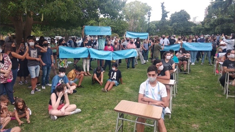 De la manifestación rosarina también participaron docentes, alumnos y padres. La jornada se realizó de manera simultánea en diferentes localidades argentinas “por una apertura de las escuelas de manera inmediata para que los chicos no tengan que comenzar otro ciclo lectivo de manera virtual”.