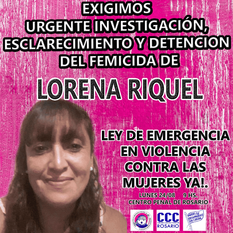 Organizaciones sociales se movilizarán el próximo lunes para reclamar justicia por Lorena Riquel, la mujer de 39 años que fue víctima de un brutal femicidio este sábado a la madrugada en Rueda al 5500, Rosario.