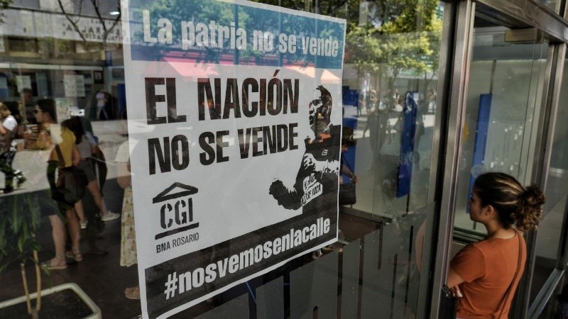 Este jueves, los trabajadores del Banco Nación Argentina de la sucursal Rosario están en asamblea con el objetivo de organizar un plan de lucha contra el anuncio de privatización de la entidad, pronuciado por el presidente Javier Milei. Además de colgar carteles en las paredes y las puertas de ingreso del Banco, los empleados votarán por un abrazo solidario previo a la movilización convocada por partidos políticos y sindicales.