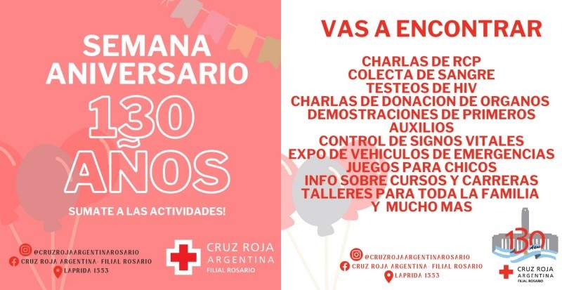 Talleres, colecta de sangre y actividades gratuitas toda la semana. La Filial Rosario de Cruz Roja cumple este miércoles 130 años de labor humanitaria y, por tal motivo, organizan y realizan una serie de encuentros a los que invitan a la ciudadanía a sumarse "por el amor y el respeto".