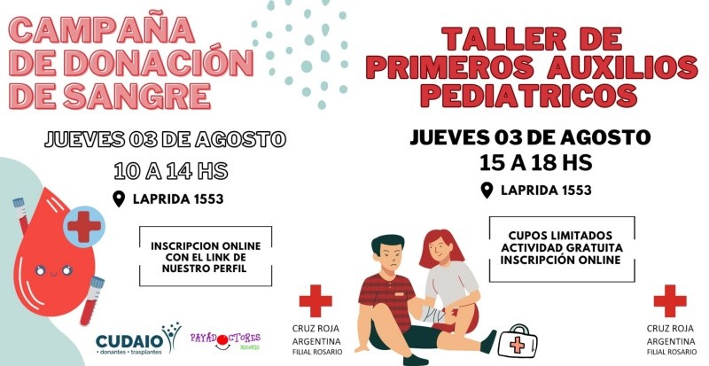 - Por su parte, el taller de primeros auxilios pediátricos tendrá lugar en la misma dirección y será el jueves 3 de 15 a 18. Es una actividad gratuita, con cupos limitados y requiere de una previa inscripción online.