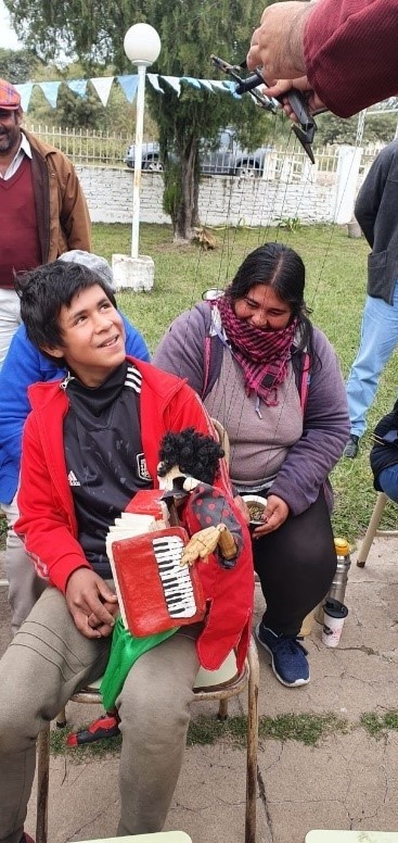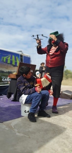 A la “Escuela que rueda” también se suma Galupa, un payaso histriónico que, junto a Mario, provoca la risa de todos los presentes y homenajea a las infancias rurales al son de las músicas del Chango Spasiuk y de Tarragó Ros, que invitan a levantar polvareda en los patios de tierra al ritmo del sapucai.