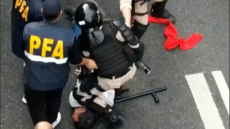 Olveira terminó en el suelo producto del avance de los policías, que también reprimieron y demoraron a otros manifestantes durante la movilización que los jubilados llevan a cabo los días miércoles.