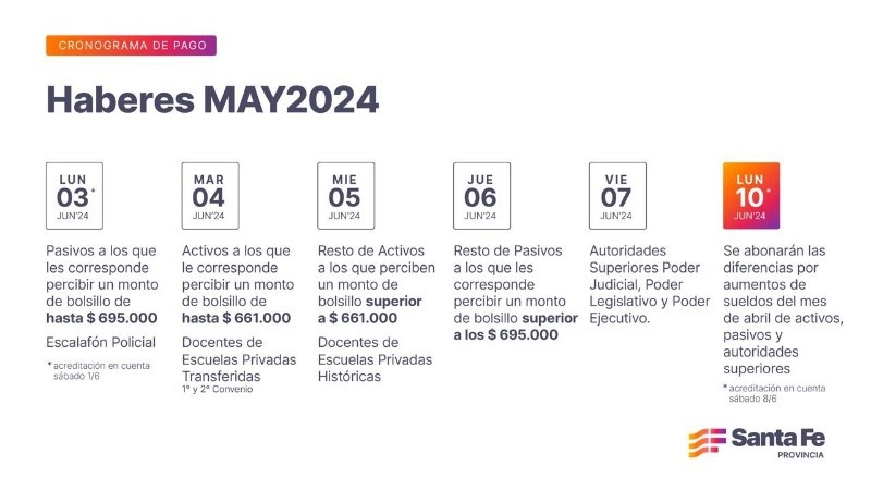 El gobierno de Santa Fe difundió este jueves el cronograma de pago a los empleados estatales que percibirán los haberes de mayo desde el lunes 3 de junio. La gestión provincial detalló que la liquidación incluye el aumento del 14 % acordado en la última paritaria (9 % correspondiente a abril y 5 % correspondiente a mayo). Además, el diferencial restante (9 %) no cobrado en abril se abonará el 10 de junio.