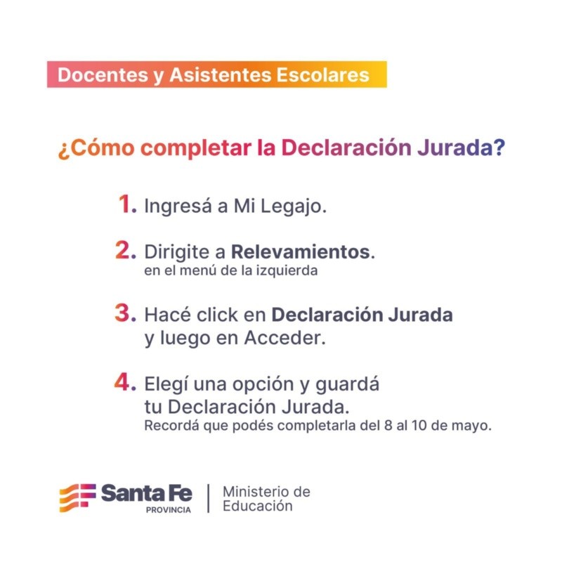 Quienes quieran completar la declaración para manifestar su rechazo a la medida de fuerza, deberán ingresar en Santafe.gob.ar/Milegajo, ingresar al apartado “Mi Legajo”, luego buscar en el menú izquierda la pestaña “Relevamientos” y finalmente “Declaración Jurada”. Una vez ahí dentro, podrá elegir entre tres opciones: “Presté servicio”; “Fui a prestar servicio y el establecimiento estaba cerrado”; “No me corresponde prestar servicio en el día 8 de mayo”.