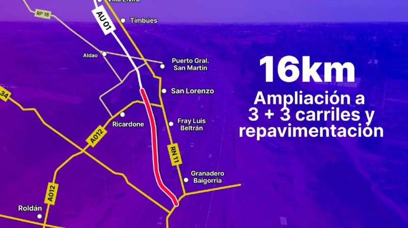 La obra, con la que se agregará un tercer carril de 3,65 metros de ancho sobre la banquina interna (sobre la mano izquierda) en ambas manos de circulación, tendrá un plazo de ejecución de 12 meses y un presupuesto oficial de $55.306.489.428,55. El acto licitatorio, realizado en la Bolsa de Comercio de Rosario, contó con 8 oferentes.