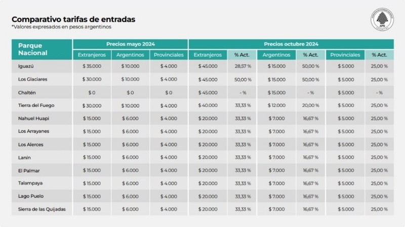 La Resolución 228/2024, publicada este lunes en el Boletín Oficial, establece que los incrementos se aplicarán en los Parques Nacionales Iguazú, Los Glaciares, Lago Puelo, Tierra del Fuego, Nahuel Huapi, Los Arrayanes, Los Alerces, Lanín, El Palmar, Talampaya y Sierra de las Quijadas, conforme a los valores y categorías correspondientes. Los precios variarán entre $20.000 y $45.000 para turistas extranjeros, $7.000 y $15.000 para turistas nacionales, y $5.000 para visitantes provinciales. En Iguazú, por ejemplo, el precio de la entrada general para el sector protegido pasará a ser de $45.000 para los extranjeros, lo que significa un incremento del 28,57 % respecto al valor anterior. Los turistas nacionales, en cambio, abonarán $15.000, un 50% más. Con esta nueva resolución, el Gobierno dispuso la creación de una nueva categoría para Estudiantes e incluyó a los Veteranos de Malvinas entre los exentos de pago. También se determinó mantener la modalidad que permite comprar un acceso para visitar el parque un segundo día con el 50% de descuento, lo cual se debe realizar dentro de las 72 horas de la primera visita. Se reglamentó, a su vez, la implementación del denominado "Flexipass", una tarifa especial que permite acceder a las áreas protegidas por el valor de dos días en lugar de tres, o por el equivalente de tres días y medio en una estadía de una semana. Este pase flexible puede utilizarse en un periodo de seis meses, de manera consecutiva o alternada, dentro de un mismo Parque Nacional.