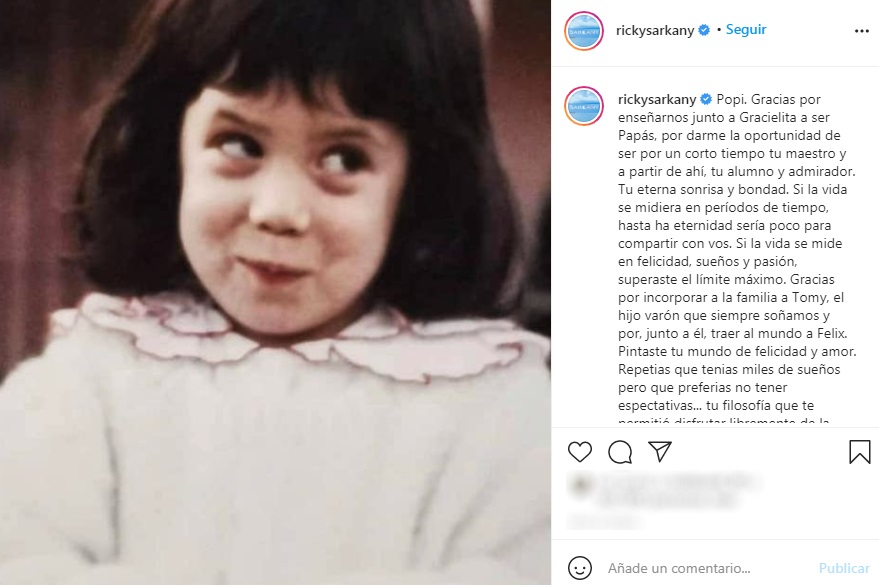 “Popi, gracias por enseñarnos junto a Graciela a ser papás. Por darme la oportunidad de ser por un corto tiempo tu maestro y, a partir de ahí, tu alumno y admirador”, se lee en el texto que publicó el empresario en su cuenta de Instagram con el título de “Papá”.