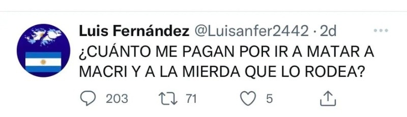 El equipo de seguridad de Macri puso en conocimiento de la Justicia la amenaza de un usuario de Twitter, publicada a fines de agosto. “¿Cuánto me pagan por ir a matar a Macri y a la mierda que lo rodea?”, escribió el usuario @Luisanfer2442. La cuenta ya se encuentra cancelada.