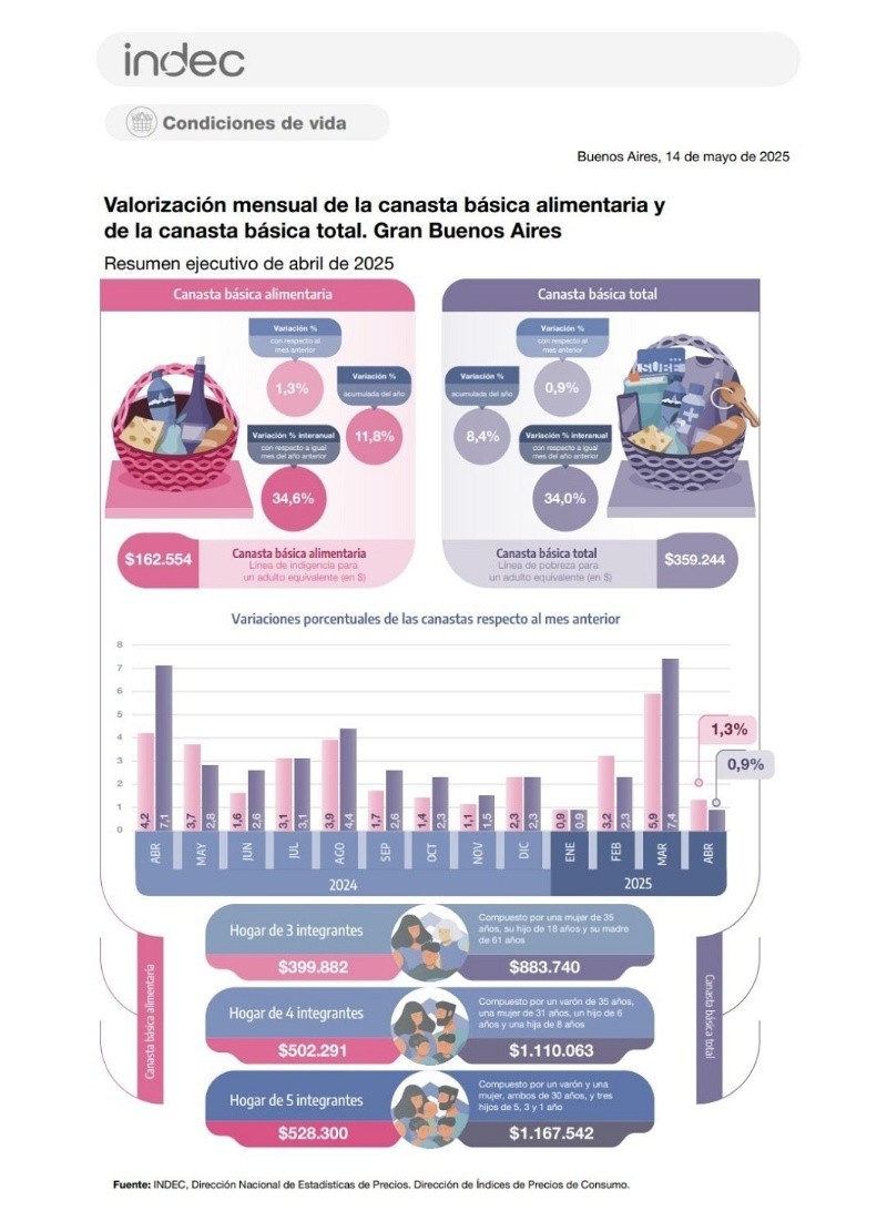 El cuadro del Indec que mostró la diputada, con datos de abril de este año, indica que la canasta básica total de $360.000 pesos es para una persona. Para una familia de cuatro personas, grupo al que se refirió Santillán, el valor es de $1.110.063.
