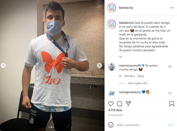 El fotógrafo reconoció el enorme gesto de Acuña en su Instagram, y escribió: "Qué te puedo decir amigo, si no paro de llorar. Si cuando te vi con esa mariposa en el pecho se me hizo un nudo en la garganta. Que en tu momento de gloria te acuerdes de mi Luchy lo dice todo. No tengo palabras para agradecerte. Te quiero mucho, campeón".