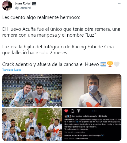 Marcos Acuña, uno de los campeones argentinos que conquistó la Copa América 2021 derrotando a Brasil en el Maracaná, llamó la atención durante los festejos en el campo de juego, en donde vistió una remera distinta a la de sus compañeros: tenía una gran estampa de una mariposa en el pecho junto con el nombre "Luz".