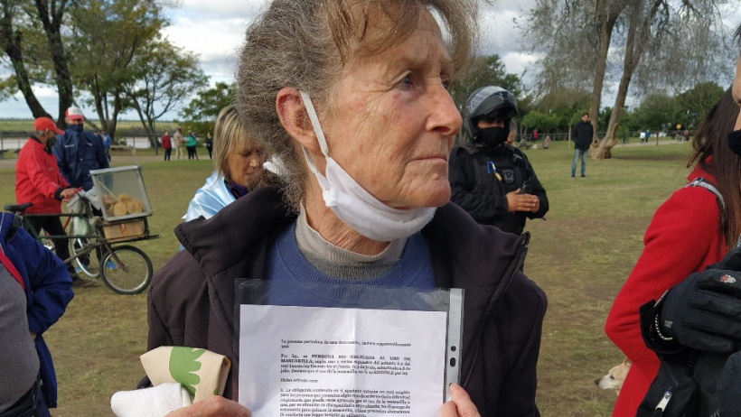 Estacioné sobre Avenida del Huerto y empecé a caminar por el parque hasta la altura de Moreno. Vi a no más de 14 personas. Una mujer rubia de unas cinco décadas fumaba mientras usaba la bandera argentina en forma de capa. Un hombre con un poncho celeste y blanco me invitó a sentarme a su lado.