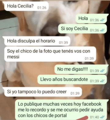 En el posteo, Cecilia puso su número de teléfono y la semana pasada un día a la madrugada llegó el tan esperado mensaje. “Disculpame el mensaje, soy el chico de la foto que tenés vos con Messi”, escribió Brian.