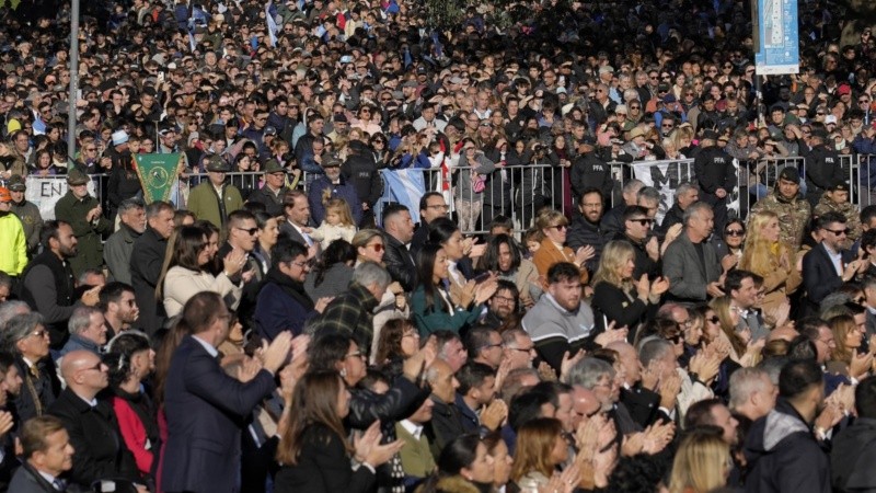 Los tres mandatarios subieron al estrado y cantaron el himno, tanto cuando habla de “la noble igualdad” como de “los libres del mundo responden al gran pueblo argentino salud”. Javkin, el primero en hablar, fue recibido con silbidos por el ala de calle Córdoba. Lejos de marcar diferencias, elogió el trabajo en común por la seguridad.