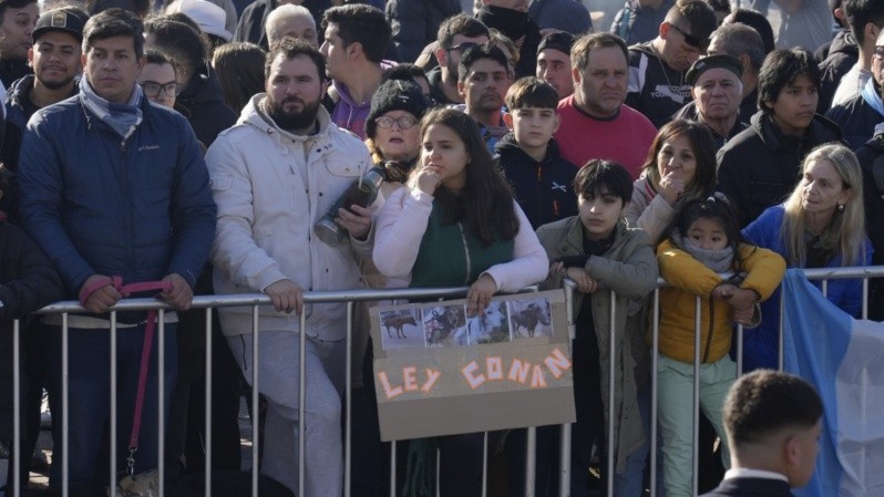 En el sector de calle Córdoba, había mayoría de hombres jóvenes, pero sobre Belgrano, de espaldas al río, el público fue más heterogéneo: familias con mate, chicos, adultos. Entre las banderas argentinas se colaron un par de La Libertad Avanza (una negra con el león amarillo), una por la "ley Conan" y otras de reclamo de justicia por víctimas de la violencia.