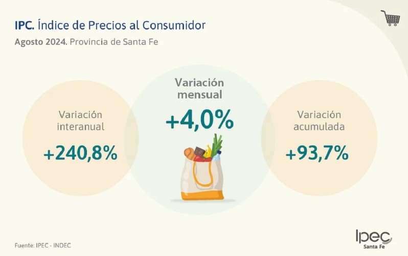 El Instituto Provincial de Estadística y Censos (Ipec) difundió este lunes el Índice de Precios al Consumidor que realiza todos los meses para monitorear la inflación en el territorio santafesino. Para agosto, el organismo determinó que la suba de precios en la provincia fue del 4%, apenas por debajo de la media nacional que fue del 4,2%.